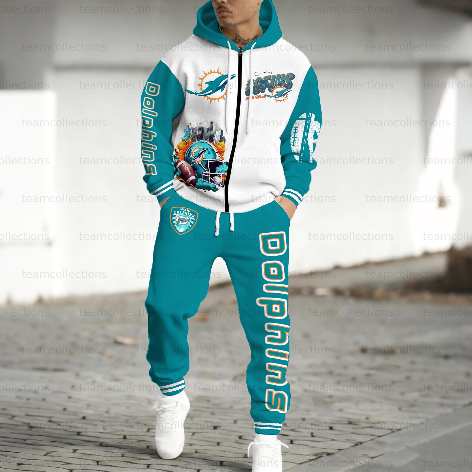 (Fleece-Lined Zip-up Hoodie) Miami Dolphins Zip-up Hoodie & Pants 2 Pieces Set