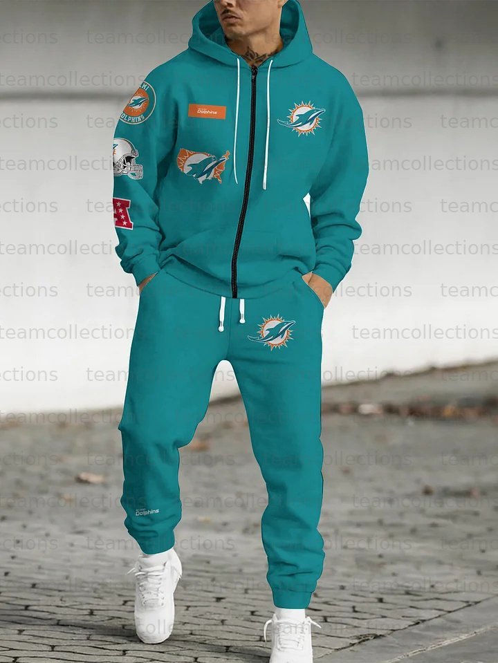 (Fleece-Lined Zip-up Hoodie) Miami Dolphins Zip-up Hoodie & Pants 2 Pieces Set